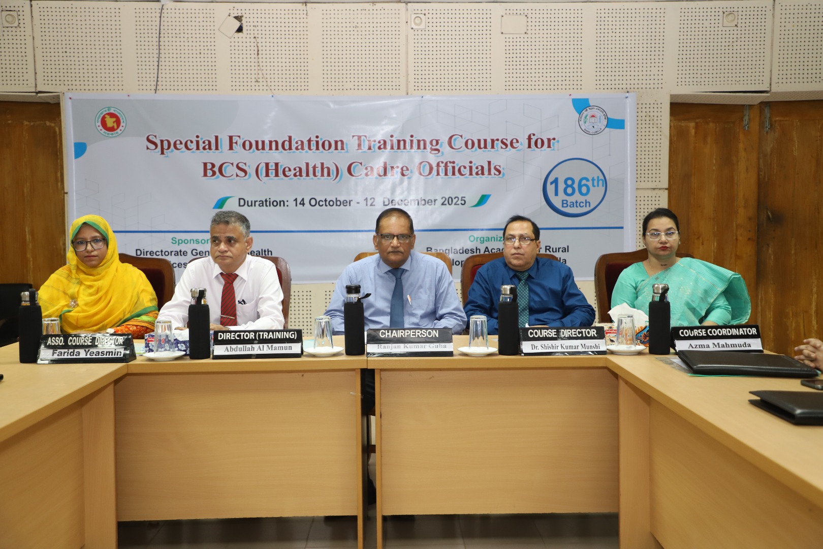 ১৪ অক্টোবর ২০২৫ তারিখ বাংলাদেশ পল্লী উন্নয়ন একাডেমিতে বিসিএস (স্বাস্থ্য) ক্যাডার কর্মকর্তাদের জন্য আয়োজিত ১৮৬তম বিশেষ বুনিয়াদী প্রশিক্ষণ কোর্সের উদ্বোধন করা হয়েছে। উদ্বোধনী অনুষ্ঠানের শুরুতে বৈষম্য বিরোধী ছাত্র আন্দোলনে যারা শহীদ ও আহত হয়েছেন তাঁদের মাগফিরাত এবং দ্রুত সুস্থতার জন্য প্রত্যাশা ব্যক্ত করা হয়। দুই মাসব্যাপী এই প্রশিক্ষণ কোর্সের উদ্বোধনী অনুষ্ঠানে সভাপতিত্ব করেন বার্ডের পরিচালক (প্রকল্প) জনাব রঞ্জন কুমার গুহ। সভাপতি তাঁর বক্তৃতায় বলেন, বুনিয়াদী প্রশিক্ষণ কোর্স হতে সরকারী কর্মকর্তাগণ সরকারী নিয়ম-কানুন, আর্থিক বিধি-বিধান সম্পর্কে স্পষ্ট ও ব্যবহারিক জ্ঞান লাভের সুযোগ পেয়ে থাকেন। সরকারী চাকুরিজীবি হিসেবে জনগণের জন্য কী করণীয় ও নিজের প্রাপ্যতা সম্পর্কেও প্রশিক্ষণার্থীবৃন্দ সম্যক ধারণা লাভ করেন। এই প্রশিক্ষণ কোর্সের সফল সমাপ্তির মাধ্যমে সরকারি চাকুরিতে পরবর্তীতে পদোন্নতি ও চাকুরি স্থায়ীকরণ হয়। কাজেই বুনিয়াদি প্রশিক্ষণের বিশেষ গুরুত্ব রয়েছে। উদ্বোধনী অনুষ্ঠানে স্বাগত বক্তব্য প্রদান করেন বার্ডের পরিচালক (প্রশিক্ষণ) জনাব আবদুল্লাহ আল মামুন। কোর্সের সার্বিক বিষয় প্রশিক্ষণার্থীদের নিকট অবহিত করেন কোর্সের কোর্স পরিচালক ড. শিশির কুমার মুন্সী, পরিচালক (কৃষি ও পরিবেশ), বার্ড। কোর্সের সহযোগী কোর্স পরিচালক হিসেবে দায়িত্ব পালন করছেন মিজ ফরিদা ইয়াসমিন, উপপরিচালক, বার্ড। এছাড়া কোর্সটির সমন্বয়কের দায়িত্ব পালন করবেন বার্ডের যুগ্মপরিচালক (প্রশিক্ষণ) মিজ আযমা মাহমুদা। এ প্রশিক্ষণ কোর্সটিতে অংশগ্রহণ করেছেন বিসিএস (স্বাস্থ্য) ক্যাডারের ৫০ জন কর্মকর্তা।